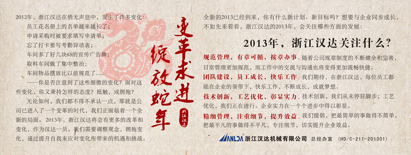 2013年,浙江漢達(dá)將從規(guī)范管理、團(tuán)隊建設(shè)、技術(shù)創(chuàng)新、精細(xì)管理四個方面著力,目的在于為客戶提供更具價值的產(chǎn)品、更貼心的服務(wù),為員工提供更好的發(fā)展平臺、更多可能性的未來。