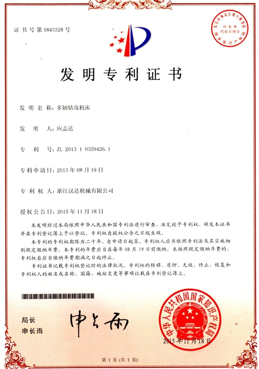 1月7日,公司首個發(fā)明專利“多軸鉆攻機床”證書到手
