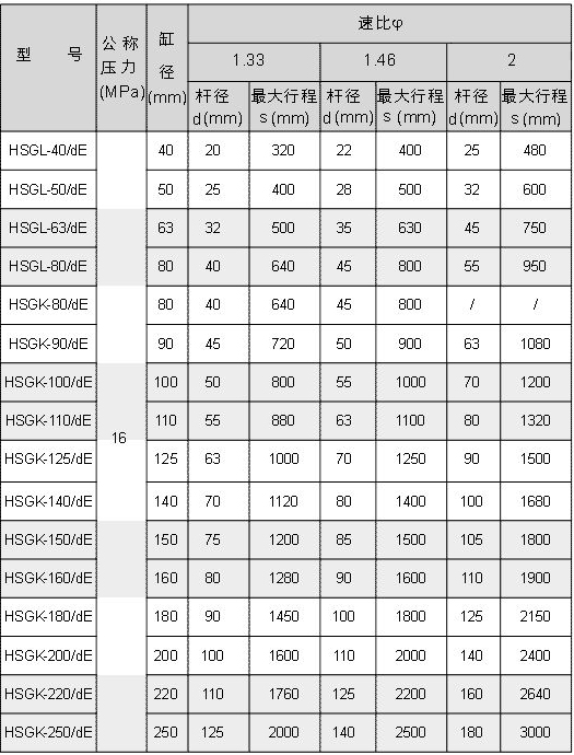 HSG系列工程液壓缸基本參數(shù),包括缸徑、桿徑、最大行程。