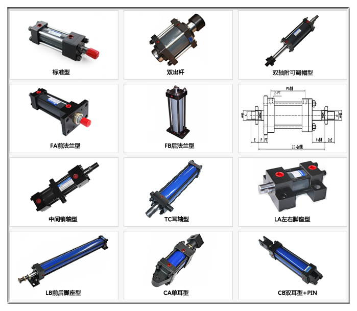 標準型、雙出桿、雙軸附可調(diào)帽型、FA前法蘭型、FB后法蘭型、中間銷軸型、TC耳軸型、LA左右腳座型、LB前后腳座型、CA單耳型、CB雙耳型+PIN。